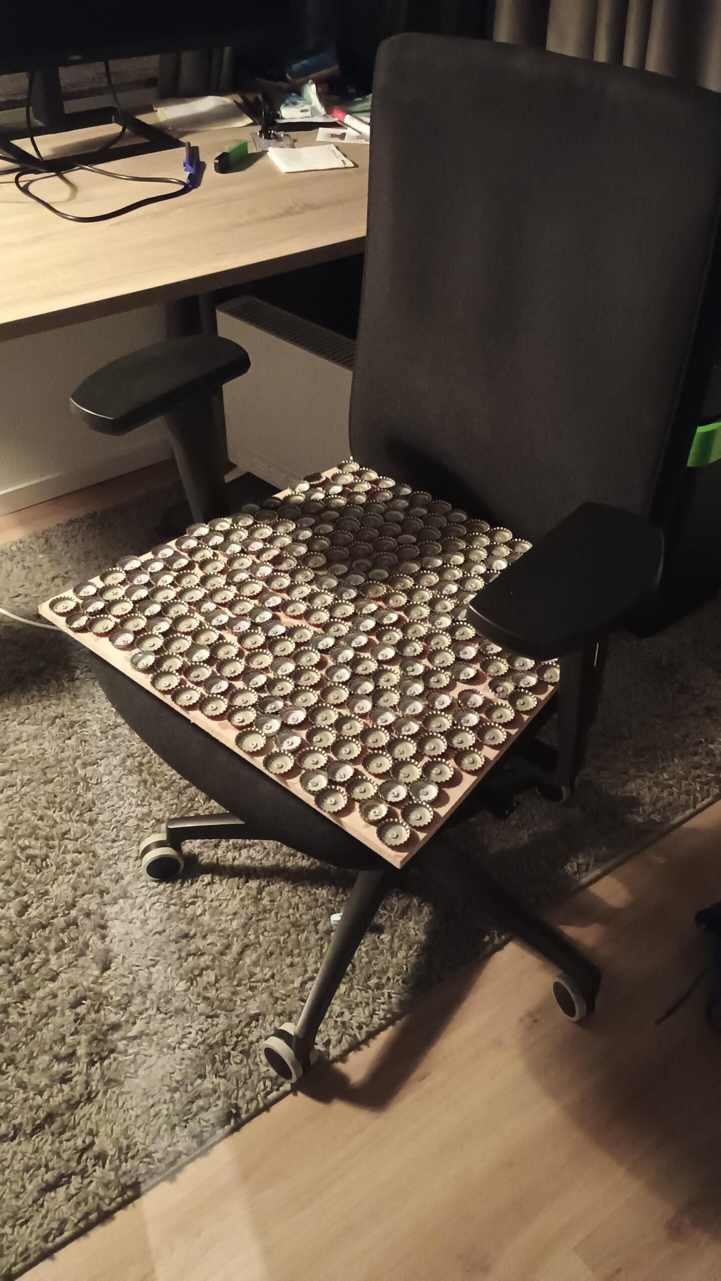 Hij nam plaats op de dopjes en had in 1 minuut spijt van deze keuze, de stoel bewoog alle kanten uit, en dit was echt niet vol te houden. Hij verwisselde de bureaustoel voor de strafstoel, ietsjes te laag, maar in elk geval veel stabieler.
